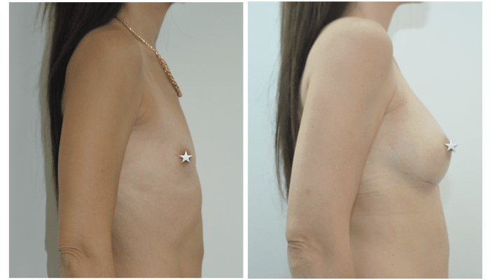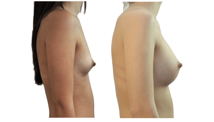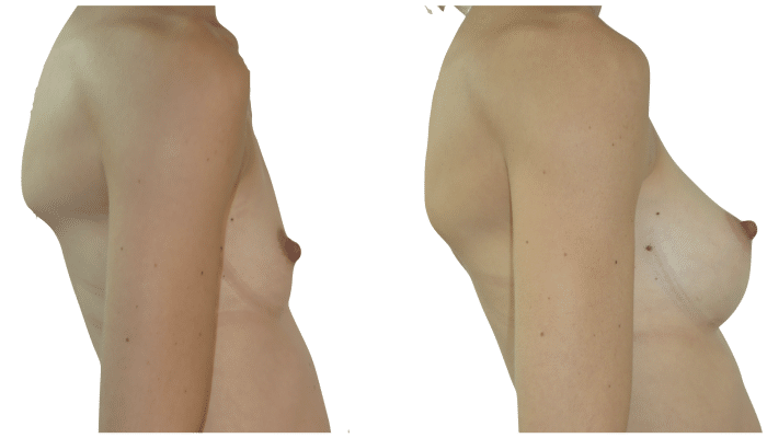 Augmentation mammaire par prothèses anatomiques de 320cc en position rétropectorale par voie hémiaréolaire inférieure vue de profil
