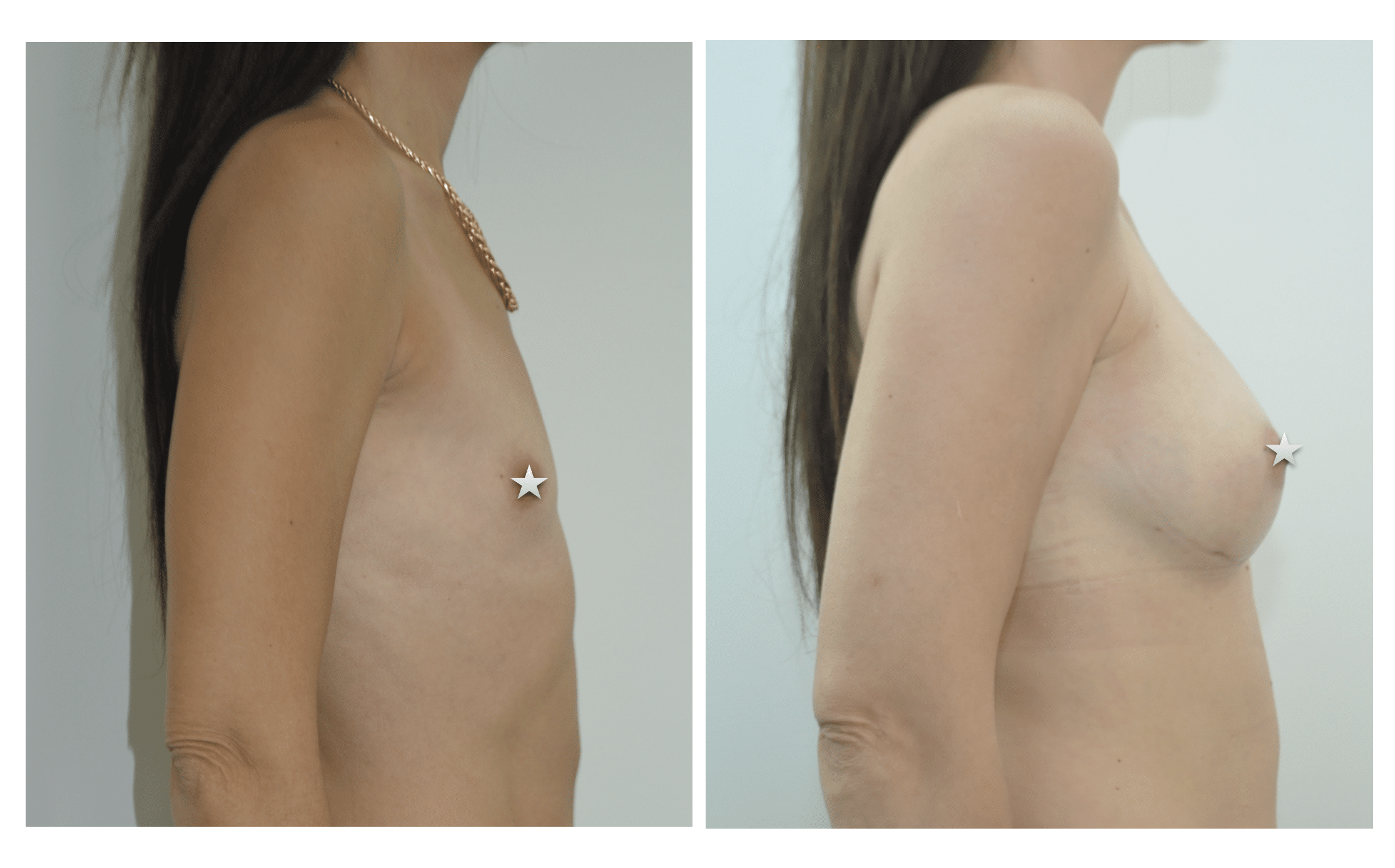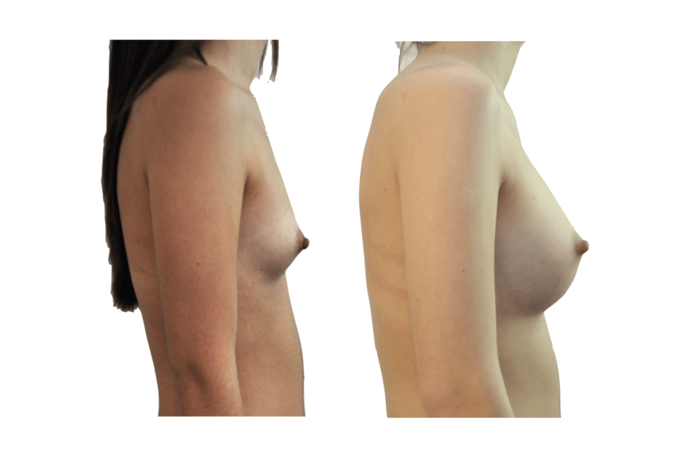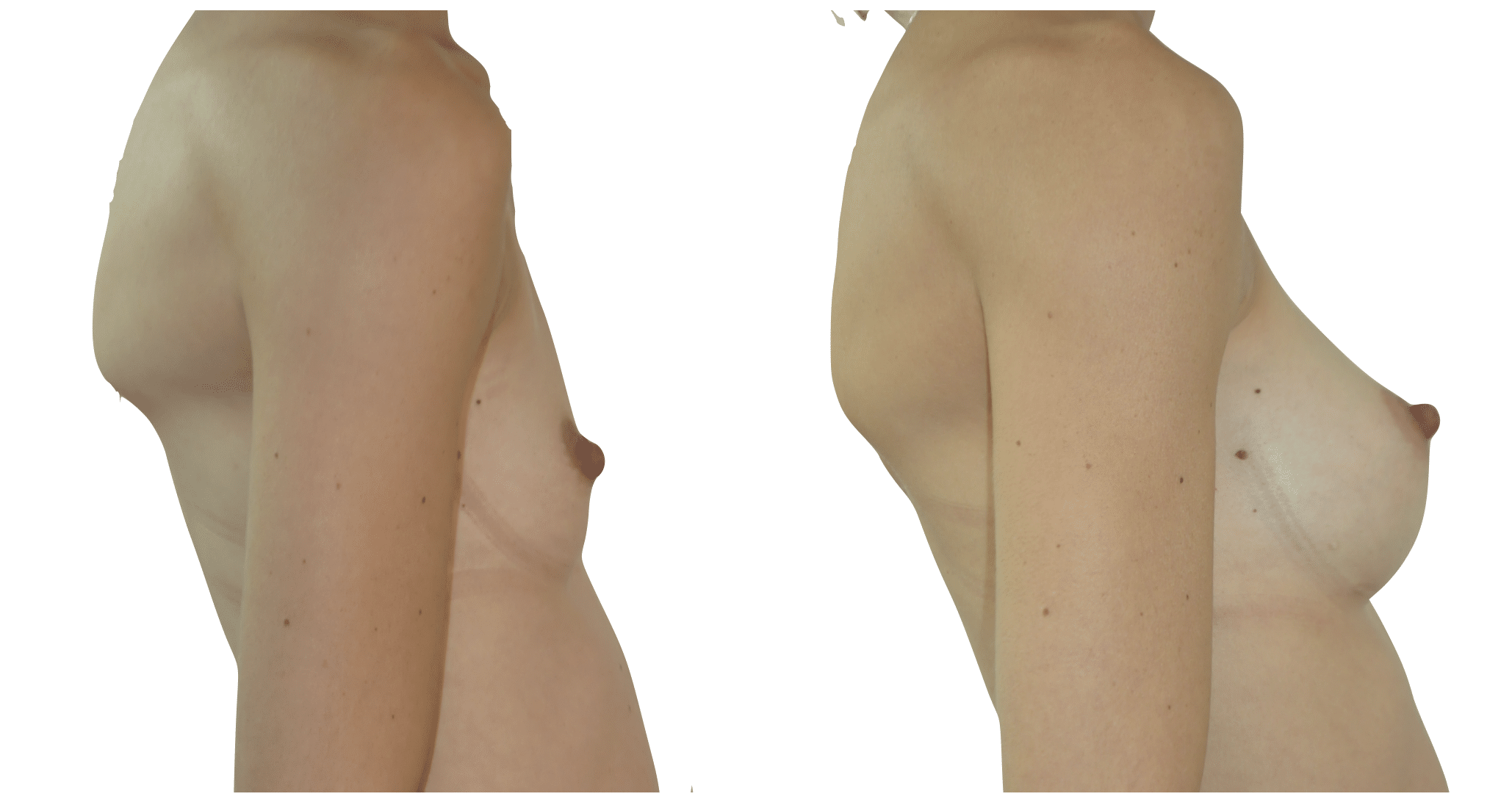 Augmentation mammaire par prothèses anatomiques de 320cc en position rétropectorale par voie hémiaréolaire inférieure vue de profil